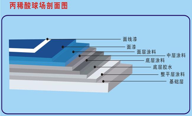 4、面層:由色彩鮮艷、抗紫外光的丙烯酸涂料鋪成增加耐磨性。